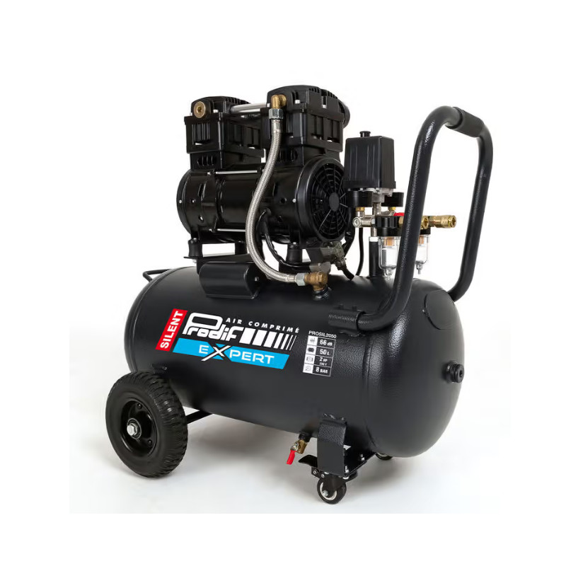Le compresseur silencieux Prodif PROSIL2050 est un modèle 2 CV monophasé, cuve de 50 L, pression maximale de 8 bars et débit restitué de 170 L/min. Niveau sonore réduit d’environ 66 dB(A). Idéal pour les travaux d’atelier, gonflage, soufflage ou clouage.